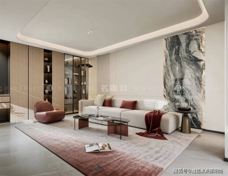 走进客厅,映入眼帘的是大理石墙面,冷艳而高贵,与玻璃展示柜的通透、金属边桌的冷冽形成了微妙的对比,仿佛在诉说着家的坚韧与柔情。
