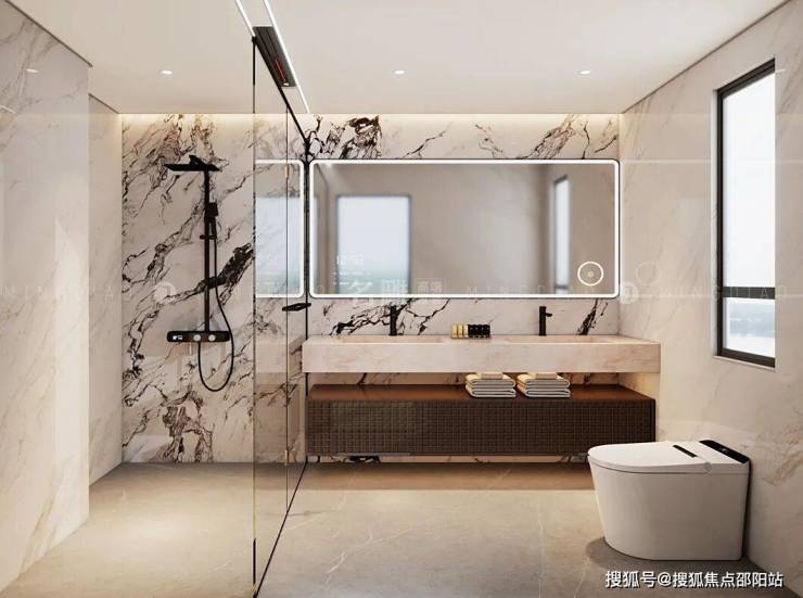 悬浮式洗手台下方精心设置了收纳区域,整齐叠放的毛巾与小巧的收纳盒,既满足了日常用品的收纳需求,又保持了空间的整洁与美观。