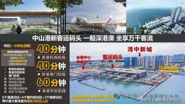 中山港新客运码头,为国家一级口岸,预计最大客流量可达300万人次/年,连接黄金内湾100公里,也将带来不可估量的客流红利!