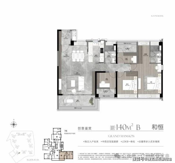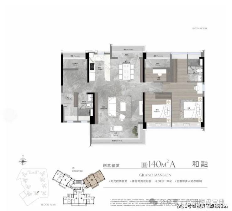 建面140平四房,动静分区、全屋全明设计,入户玄关,约8米双连宽景阳台,LDKG一体化设计,主卧小家化。