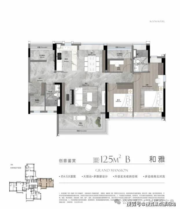 建面125平四房,LDKG一体化设计,L型独立岛台中西厨房,7米南向采光景观阳台,可改成四房两卫,步入式衣帽间。
