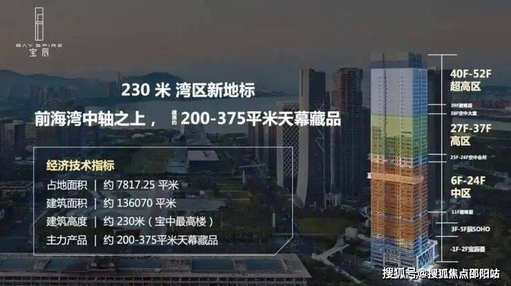 华侨城宝辰总高230米,为宝中最高楼;项目52层,分为中区、高区、超高区,6层起卖,11、39F为避难层,25-26F为空中会所,28F为空中大堂。除了空中大堂项目还有地下入库大堂+首层大堂,一共三重大堂。
