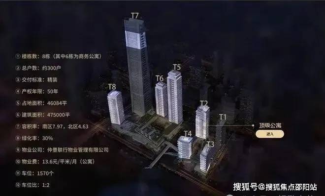 以8座塔楼错落布局构成总建面约47.5万平方米的垂直艺术群落。