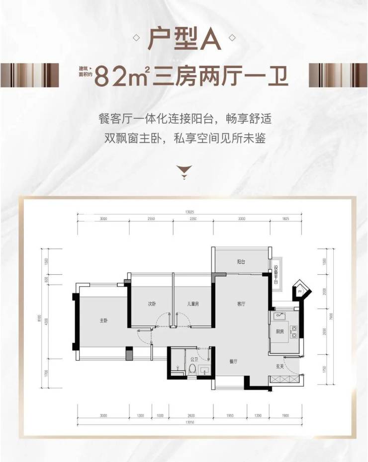 82㎡三房一卫,有通透和竖厅两种户型,均为东北朝向。