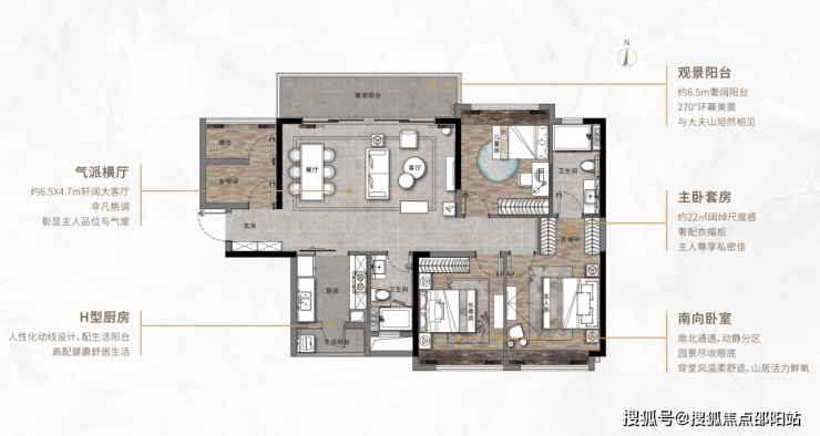 双阳台南北对流,6.5m超宽景观阳台,望大夫山、园林中轴双重景致;
