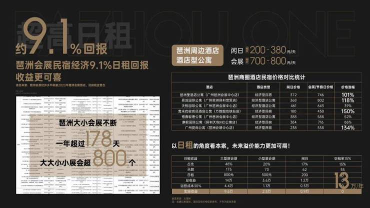 2023年琶洲展会全年举办800场,共178天,以会展租价计算,区域内商办产品一年最高可达13万/年超高收益,民宿经济约 9.1%日租回报 更可喜!