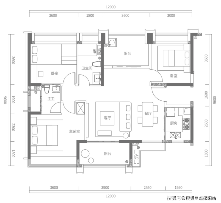 C户型建面约120㎡,3+1房2厅2卫
