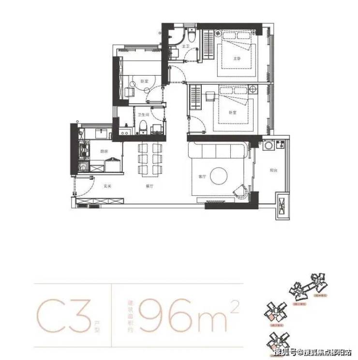 户型面积布局C496平三房两厅两卫