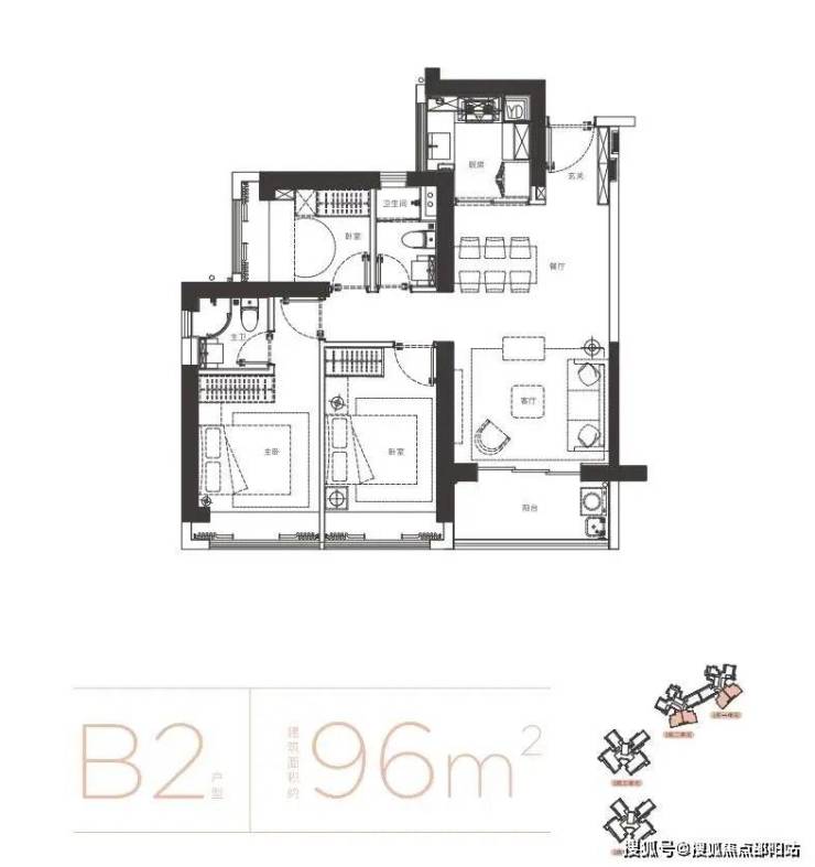户型面积布局B296平三房两厅两卫