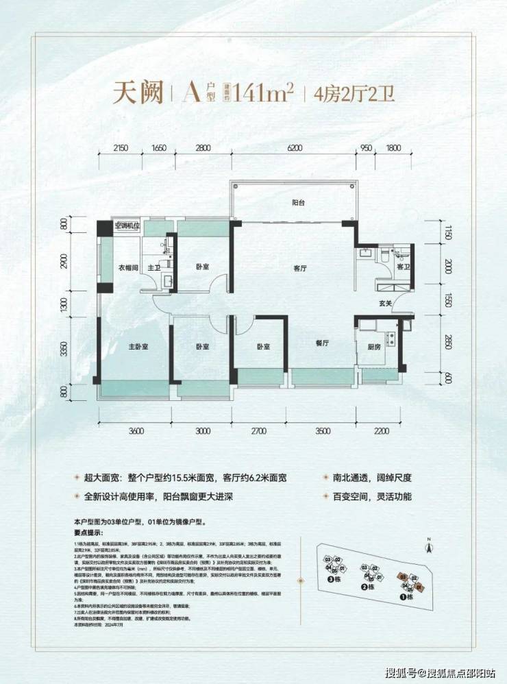该户型南北通透,拥有约15.5m的超大面宽,五大空间朝南,南向采光面约15m,景观视野极佳,可谓豪门进阶大户!