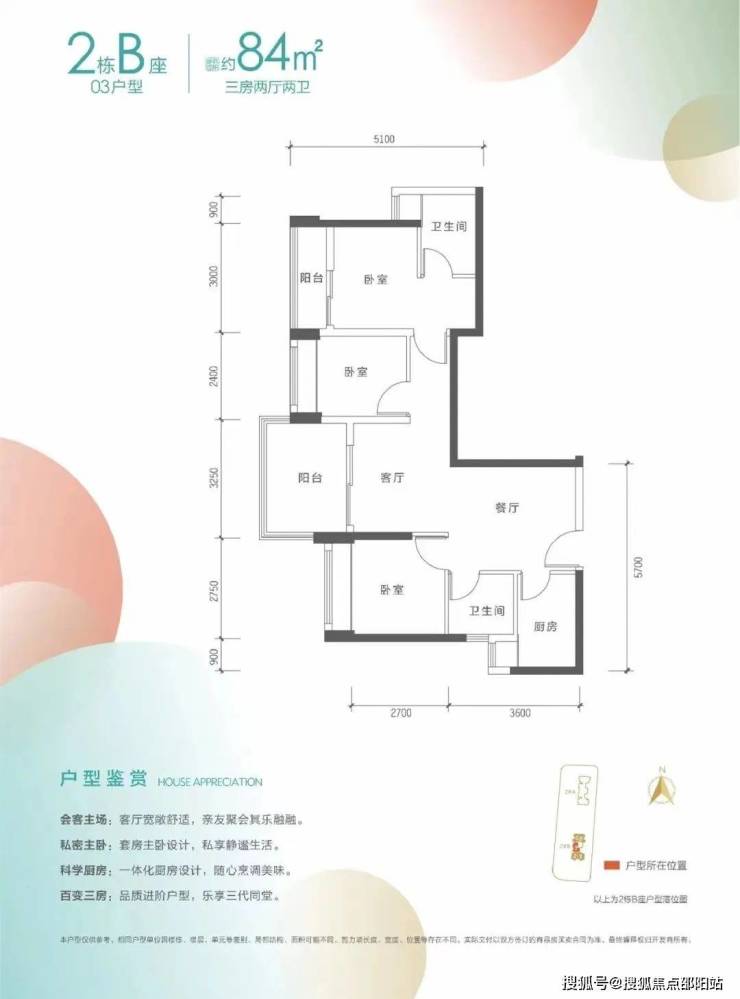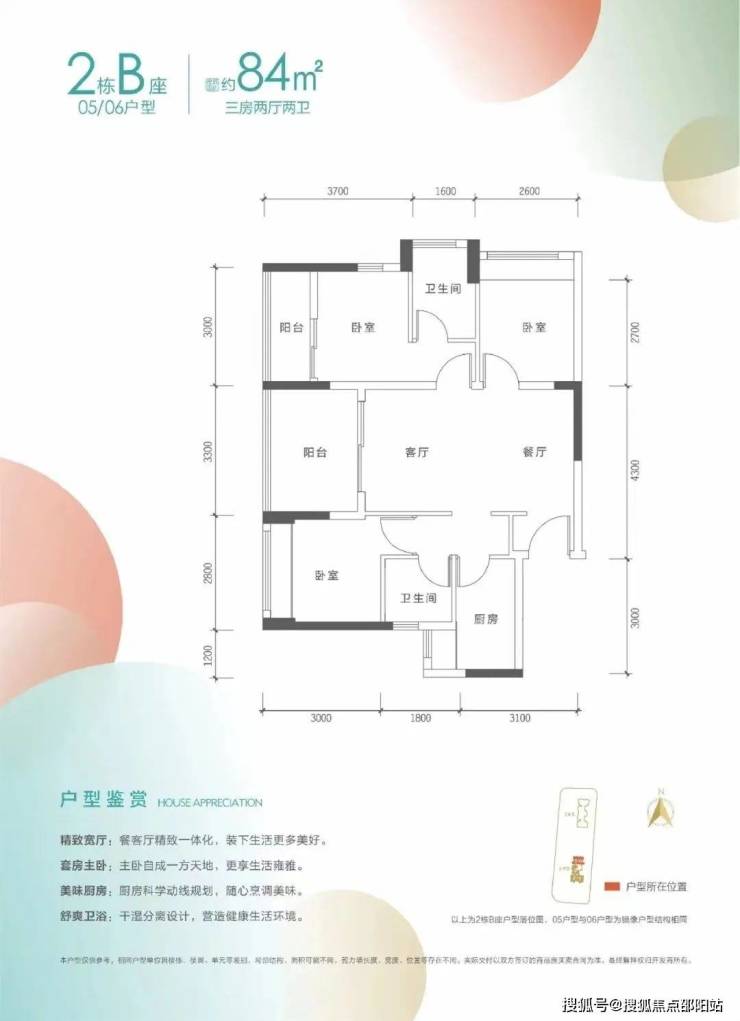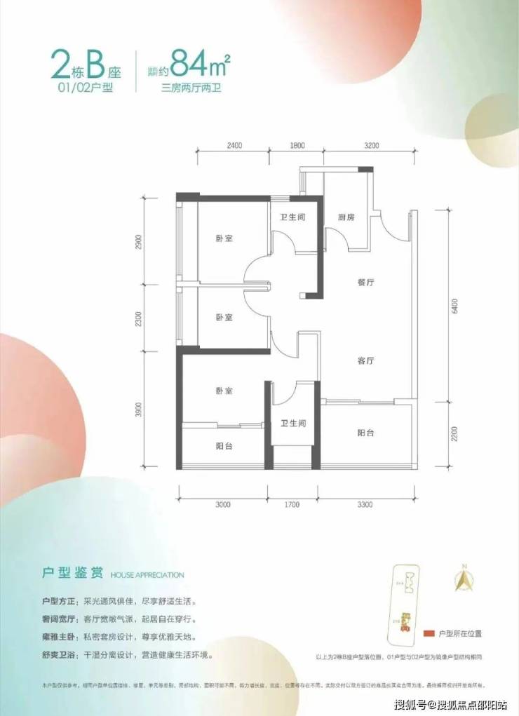 84㎡的3房2厅2卫,2栋B座01.02户型,设计的是竖厅格局,客厅3.3米开间,LDKB一体化,3个卧室分别做到了3米/2.9米/2.3米的宽度,客厅主卧双阳台设计,L型厨房,公卫三段式分离,得房率:76.04%(不含赠送),阳台朝南向,看楼岗大道。