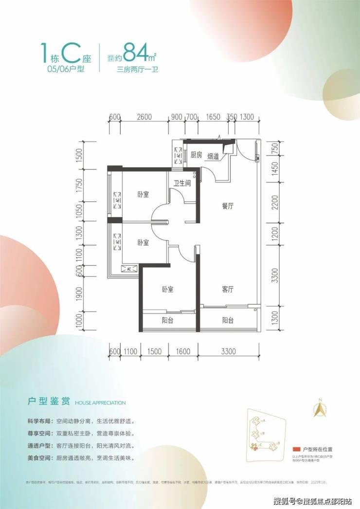 84㎡的3房2厅1卫,1栋C座05.06户型,设计的是竖厅格局,客厅3.3米开间,LDKB一体化,3个卧室分别做到了3.1米/2.8米/2.4米的宽度,客厅主卧双阳台设计,U型厨房,公卫三段式分离,得房率:76.79%(不含赠送),阳台朝东南向,看楼岗大道。
