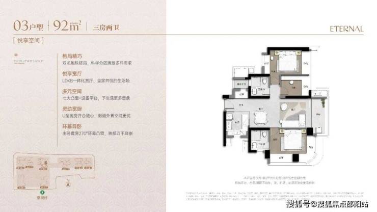92㎡三房两卫(约883-982万):双龙抱珠户型,竖厅设计,主卧带L型飘窗,大次卧有两个飘窗可通风对流,门槛友好,适合刚改家庭。