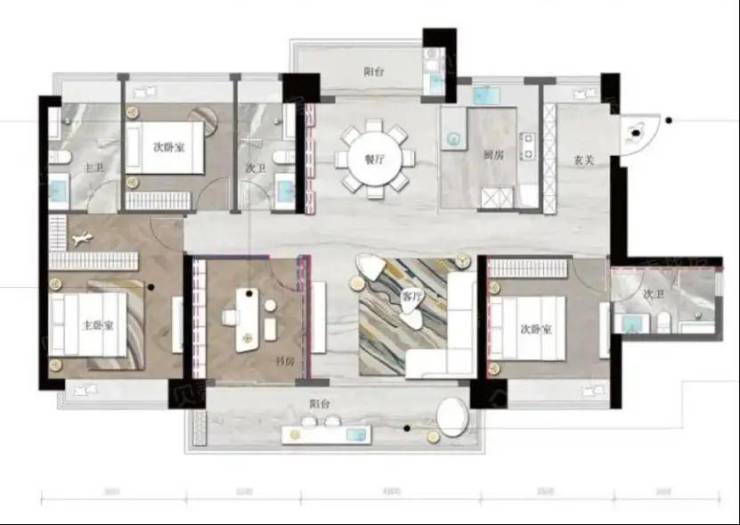 建面约178㎡四房,入户带玄关,南北双阳台。