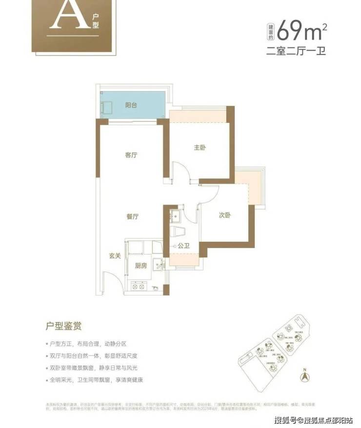 69㎡户型方正,全明设计,餐客厅和阳台自然一体,高通透、动线合理流畅之余,也完全不显拥挤,契合刚需客群需求。室内多飘窗有效提升了小户型的使用空间。