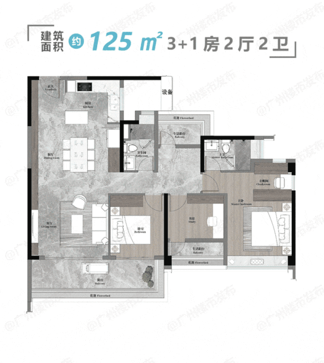 125平方米户型:四开间朝南,约7.1米巨幕南向阳台,让园林山色尽收眼底。该户型配备德曼装甲门、博世四合一智能锁、大金中央空调等顶级配置,提升居住品质。
