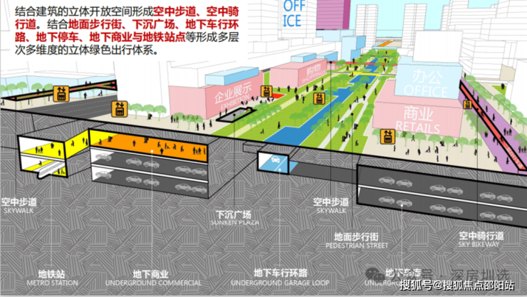 3、立体交通——未来片区多层次、多维度的立体绿色出行体系。双地铁上盖,市政规划的空中连廊系统,“0”距离接驳全城。