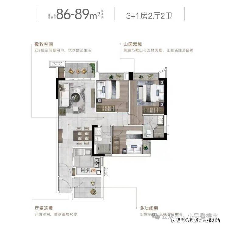 建面86平3+1房,可望马鞍山景观,进门多功能房可改成四房,实现三代同堂一步到位