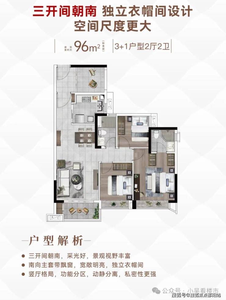 建面96平3+1房,户型动静分离,格局方正,三开间正南向,多一房可用于茶室、娱乐室、书房多功能使用,该户型也进入清货倒计时了