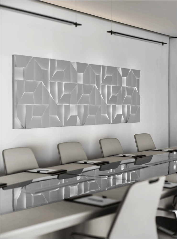 墙面具科技感的抽象符号,在此重构形成超级能量场,让智慧与社交在此碰撞,实现高效、积极、专注的办公环境。