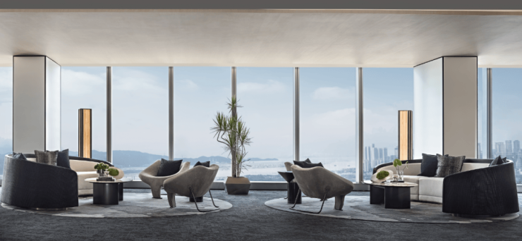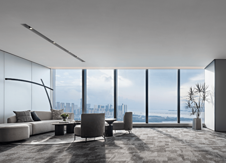 半围合的休闲区作为办公空间动态体验的一个重要节点区域,搭配舒适内敛的意式沙发,营造轻松、舒适的空间体验,作为湾区高端商务会客厅,这里不仅是办公的场所,这里是城市的缩影。