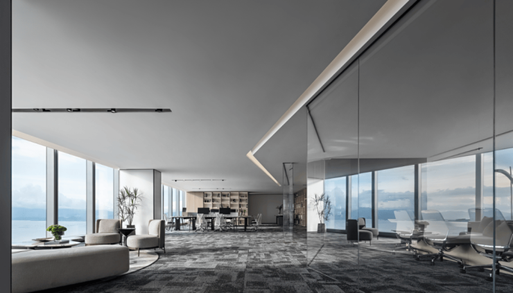 退隐自然,室内形成能量盒子包容着窗外自然的千变万幻,超2000平无界空间打造未来办公沉浸体验区,集“会所+商务+办公”为一体。