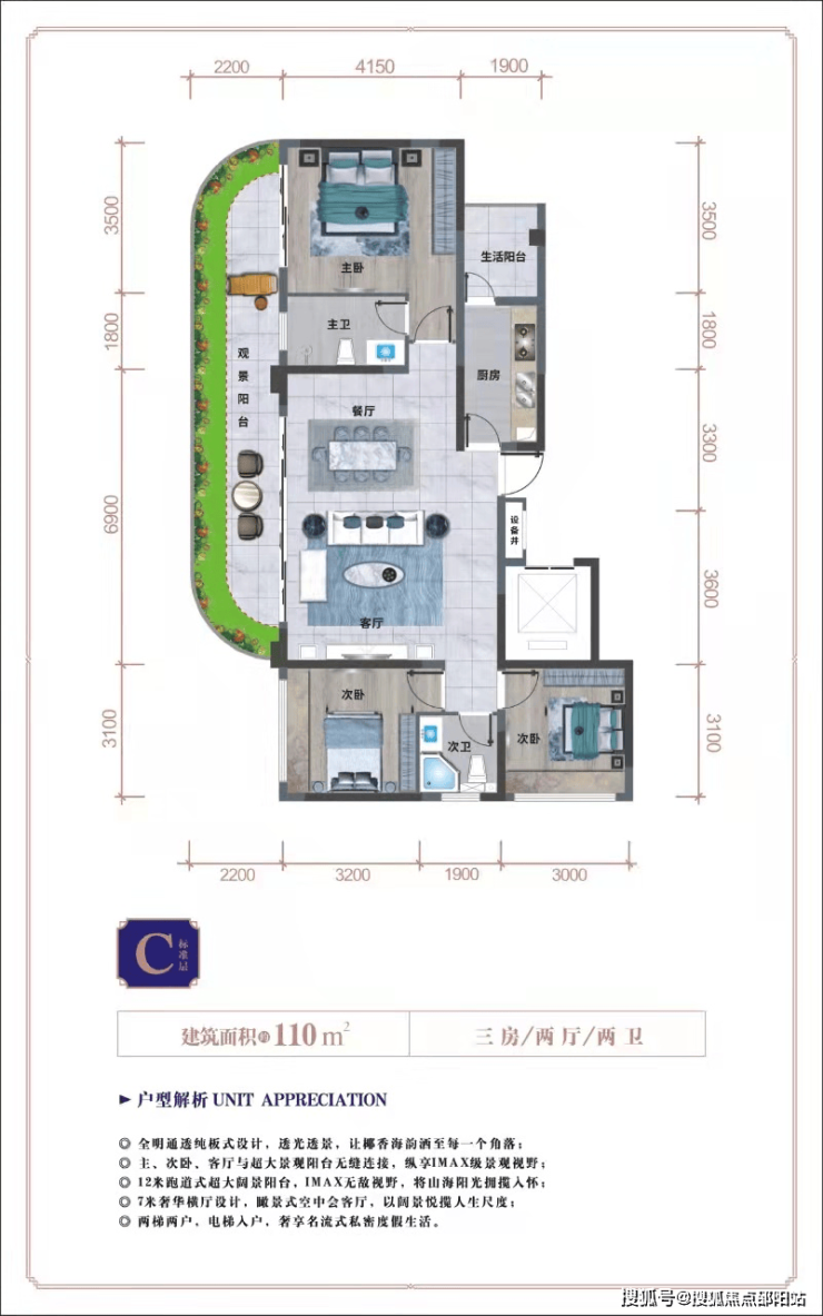 C户型:建面110㎡左右,实得141㎡左右三房两厅两卫双阳台,总价250万-320万