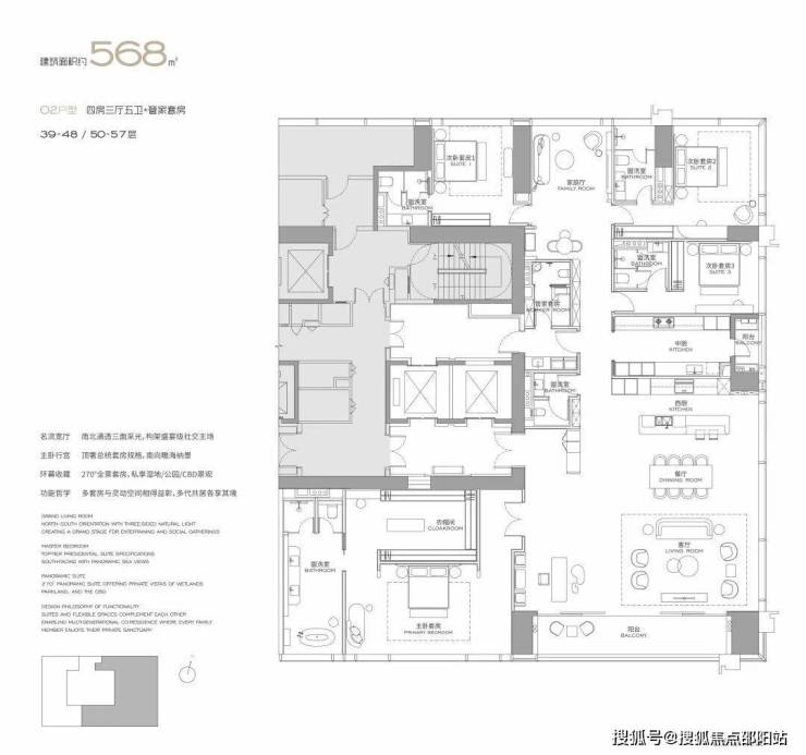 公寓面积段覆盖300-1000㎡(具体包括300㎡、400㎡、460㎡、570㎡、1000㎡等大平层),起步户型预计200㎡以上,主打“总裁级大平层”,满足高净值人群对空间尺度与私密性的需求。
