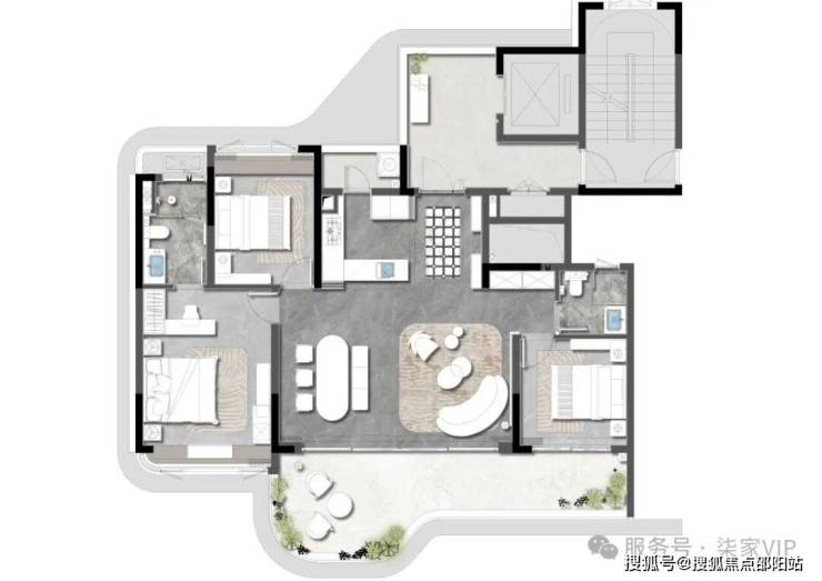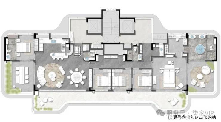 邱德光设计岛心多维共享空间,如社区“灯塔”,以蔚蓝泳池为视觉心脏,用拱廊构建地中海式或南洋风情社交氛围,涵盖恒温泳池、宴会厅、雪茄室、瑜伽室、咖啡厅、茶室等塔尖社交场域。