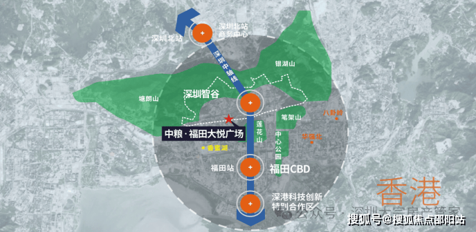 【中粮·福田大悦广场】位于福田北区梅华路与梅秀路交汇处, 紧邻轨道交通9号线孖岭站与下梅林站,形成双地铁口覆盖格局,总建筑面积约20万平方米,由中粮(深圳)智汇置业有限公司开发。该综合体包含两栋超高层研发办公塔楼(高度分别达187米和108米)及配套商业设施,采用围合式布局设计。2024年4月9日被正式认定为深圳市软件信息服务专业楼宇,获得福田区政府专项政策支持。