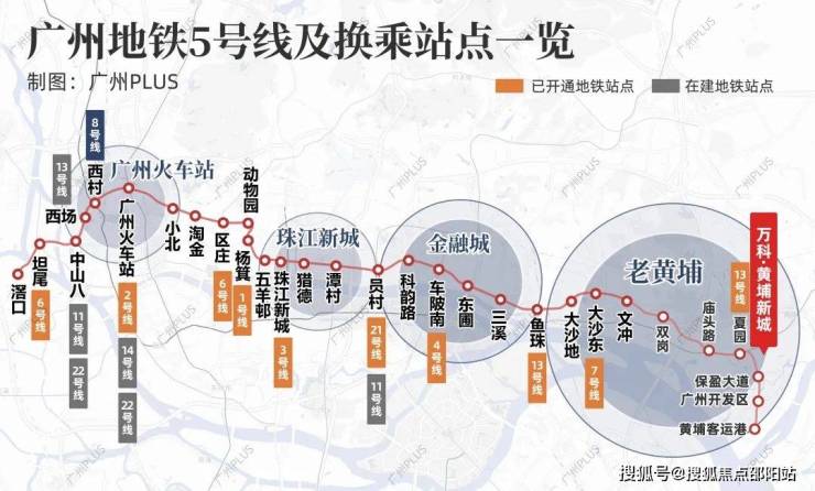 整条5号线,东西横跨黄埔、天河、越秀、荔湾,将黄埔新城与中心城区的金融城、珠江新城、白鹅潭等CBD快速连通,为未来广州西向佛山、东接东莞也做好串联准备。