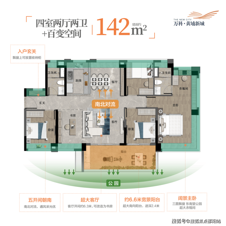 “中央公园”,紧邻大脚印公园,距离地铁约500米,紧邻学校、酒店,户型涵盖75-88㎡三房,105、125、142㎡四房