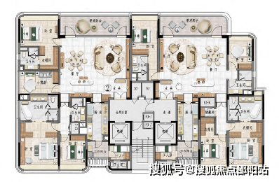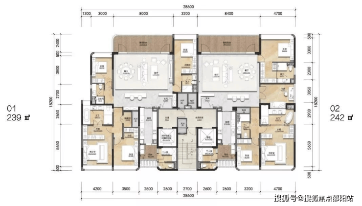 建面约239㎡的户型拥有一个宽度为8米的阳台,而建面约242㎡的户型则拥有一个宽度为8.4米的阳台。这两个户型的实用率为83.6%。