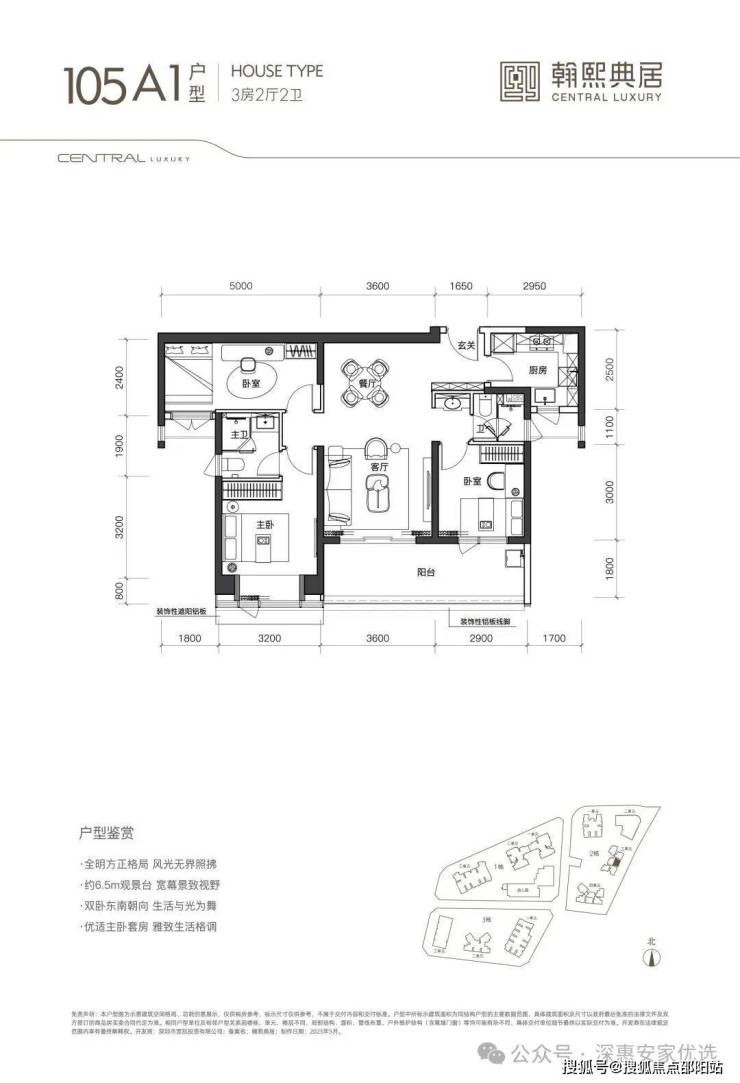 双龙抱珠布局,实用三房两厅两卫。朝南向四开间面宽共约 13.2m,全明空间,采光极佳。这个户型含赠送半阳台和飘窗的面积后使用率可达约 83%,本次首推的 02 地块 105 ㎡产品有 4 条腿