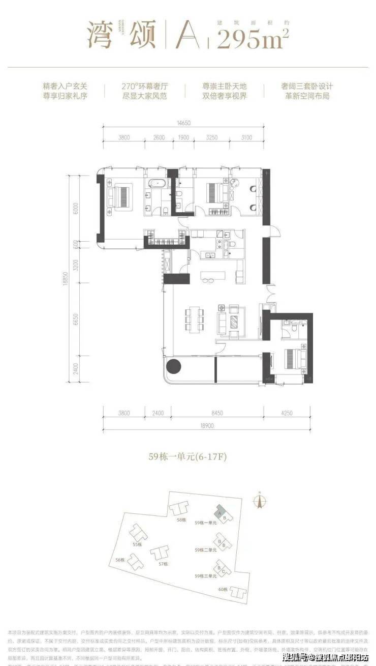 前海桂湾「前海时代尊府」取证加推最后大平层户型,为59栋的三个单元(59-1/2/3栋),面积约为215-255-295㎡,三梯两户,全南向景观,预计2026年交付。