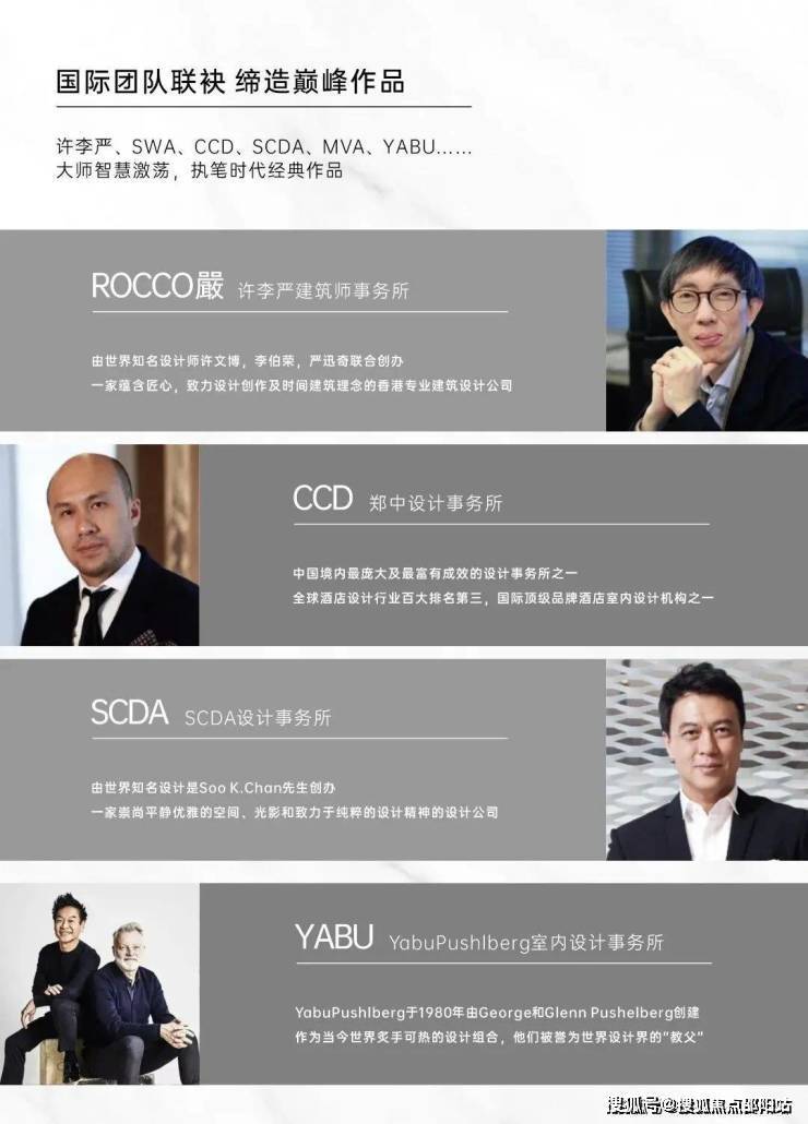 许李严、CCD、SCDA、YABU、ALT、SWA、MVA、迈进等国际顶级大师团队的智慧在此集结。