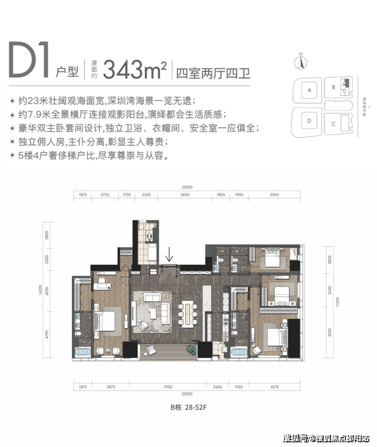 D1户型:约343㎡4房2厅4卫:B栋28-52F(高区),东朝向