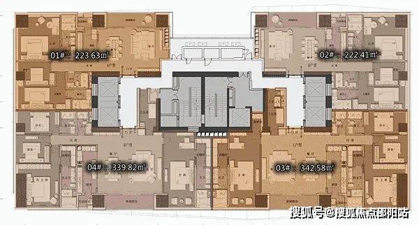 D2户型:约340㎡4房2厅4卫:B栋28-52F(高区),东朝向,户型与343㎡户型基本相同。