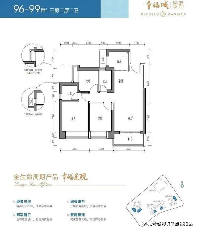 96-99㎡的3房2厅2卫,设计的是经典竖厅格局,客厅3.5米开间,LDKB一体化设计,动静分区,3个卧室分别做到了主卧14.63㎡/次卧11.07㎡/次卧7.26㎡(包含墙体飘窗),U型厨房,卫生间干湿分离,得房率约81-84%(包含赠送),东南/西南或东北朝向。