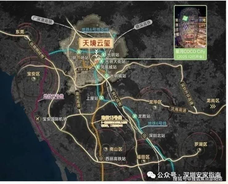 振业天境云玺毗邻光侨路、光明大道等主干道,可通过南光高速、龙大高速40分钟通达福田、南山;距离6号线光明大街站约1.3公里(步行需要20分钟),凤凰城距离约2.1公里(步行需要30分钟),其中凤凰城可换乘13号地铁线,预计2026年全线开通运营,9站到南山留仙洞,12站到南山高新园。