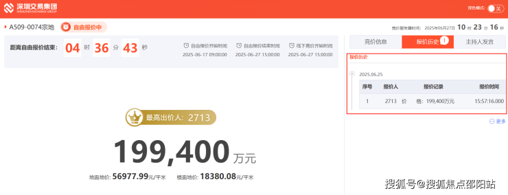 6月27日光明中心区宅地(宗地号A509-0074)由深振业、天健、深建辰投资联合体以底价19.94亿竞得。成交楼面价18380元/㎡。