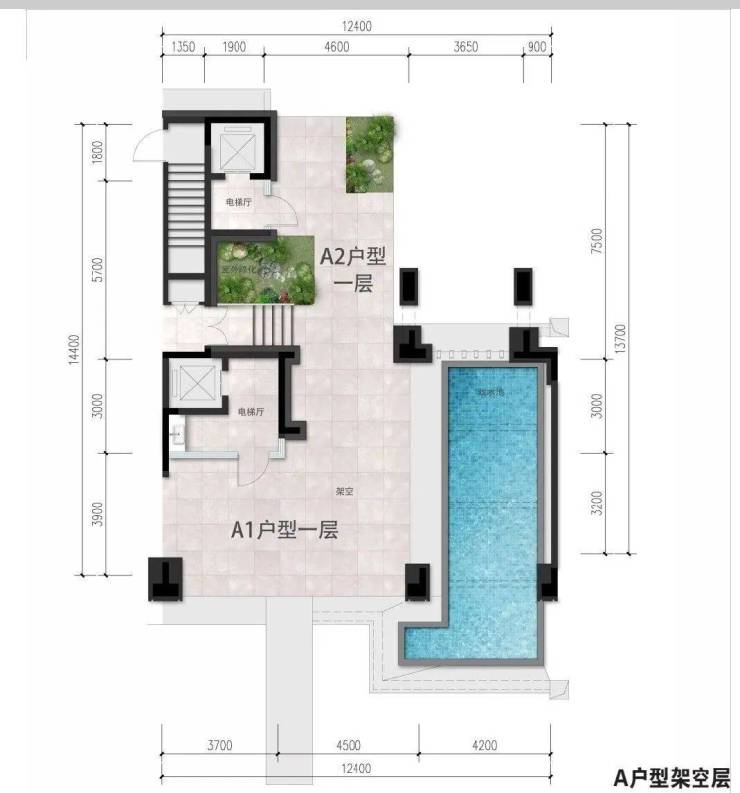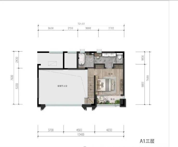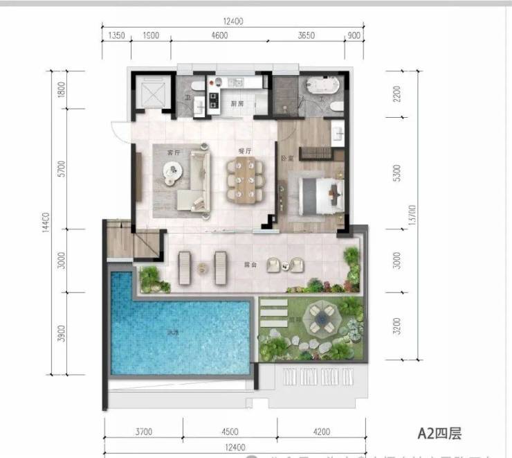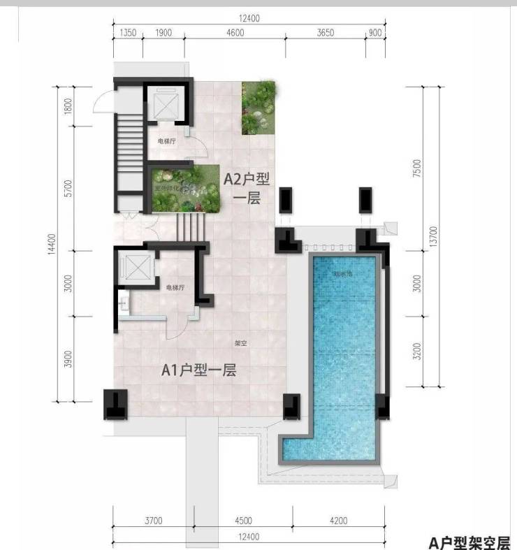 A2上叠建筑面积165㎡,3F2T4W,赠送约165平米(含地下车库65平米,4楼庭院面积83平米以及5楼阳台30平米,共4层(负一层车库+首层+4层+5层)客厅层高3.3米,卧室层高3.3米,地下车库挑高3.9米。(备注:数据仅供参考,具体以政府部门最终审定的图纸和销售合同为准。)