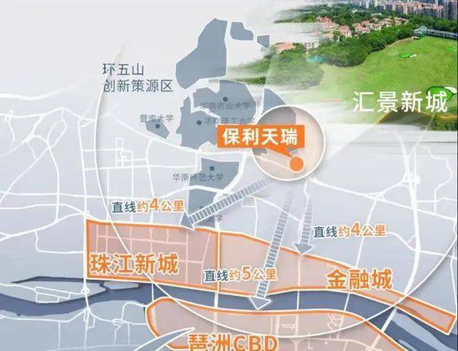 项目位于天河五山汇景新城板块内,珠江新城和琶洲金融城两中轴间的核心位置,楼盘身后就是汇景20年醇熟的圈层配套。