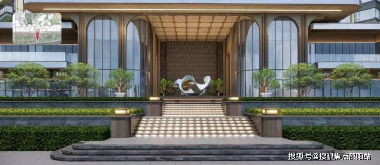 社区主入口林荫公园,9米高天际界面门楼,仪式水景岛,区内林溪水院,对景观山会客厅,营造城居五重领域归家仪式感。