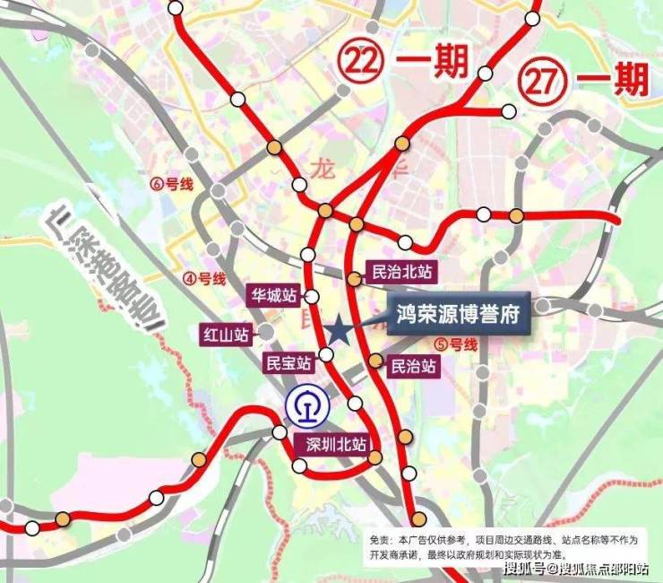 地铁:4、6号线,红山站约1.3公里。1站直达深圳北站。4站到福田。5号线,民治站约1.4公里。22号线(规划中)四轨交汇环绕。
