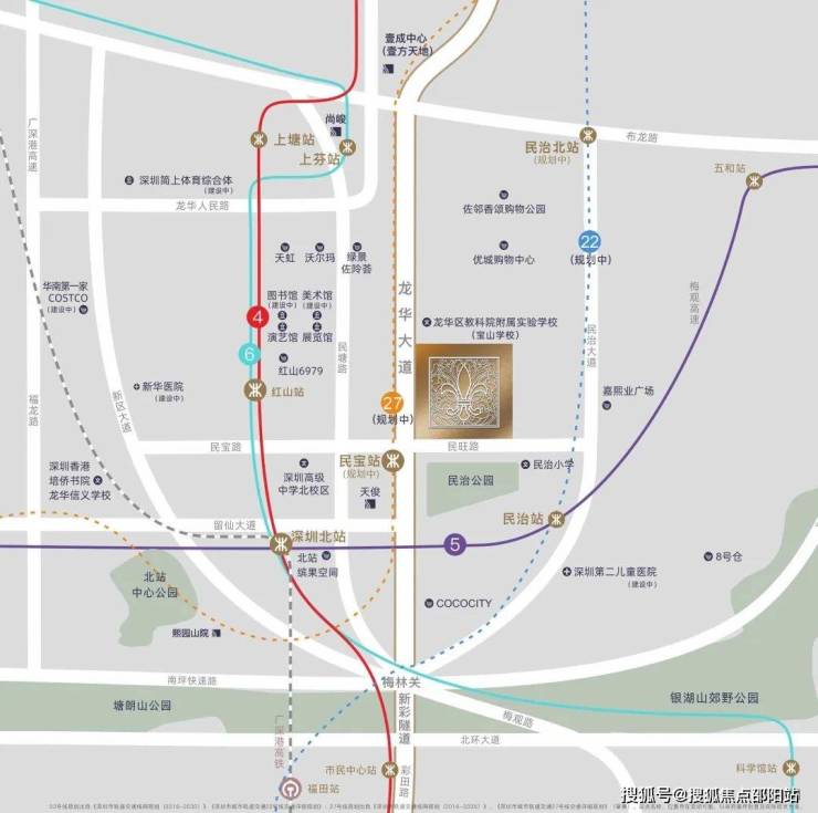 深圳北站高铁枢纽、地铁4/5/6号线已开通,22/27号线规划中,已进入招标阶段,五轨交汇环绕,五横六纵多维立体路网,无界城心繁华