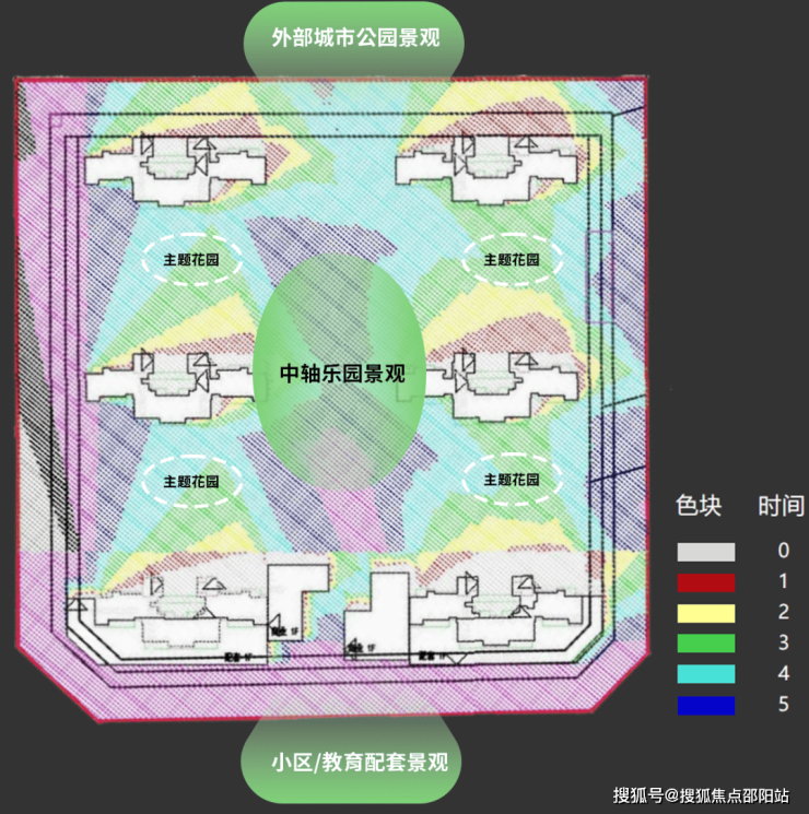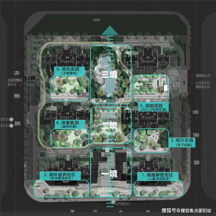 内部景观环抱三排纯板式高层,形成了“三境六园” 的空间组团,采用大面宽楼型,退让出南北约40米的奢阔楼间距,形成宽高比为1:2的超大花园空间,全年日光入户、户户观景。暖阳、清湾、绿境,满是来自北纬18°的居住幸福感。