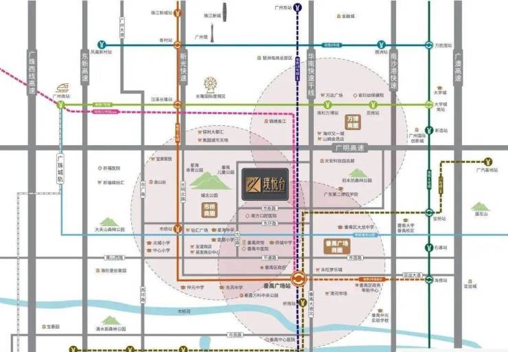 项目距离3号线市桥站约2公里 ,需要公交接驳,2站可达市桥地铁站。