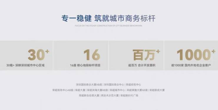 荣超集团——创立于1993年,31年开发运营经验,专注于商务写字楼开发运营,是最早进入福田CBD的专业写字楼开发商