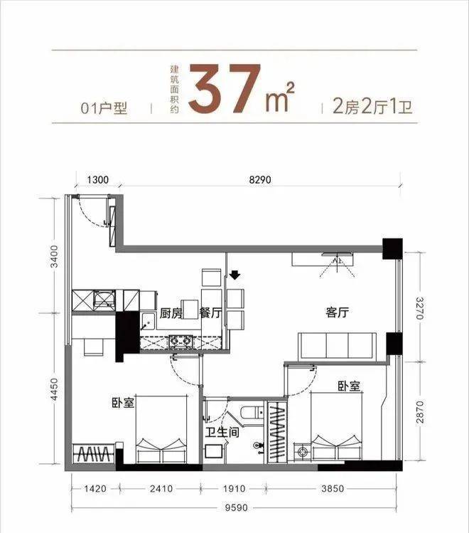 端头两面采光的01户型,建筑面积约37平两房一厅一卫,实际使用面积约64平,总价在580-630万。